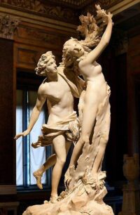 ベルニーニは17世紀最大の彫刻家である。若くして父のもとで才能を示し、ローマ教皇たちの庇護を受けて、彫刻・建築・都市演出を一体化した総合芸術家となった。アポロンとダフネでは、追跡の瞬間にダフネの身体が月桂樹へと変貌していく神話的刹那が、大理石で奇跡的に表されている。硬い石が指先では葉に、皮膚では樹皮に変わるような錯覚を生み、彫刻が運動の頂点を捉えうることを示した。ベルニーニの魅力は、素材の硬さを忘れさせるほどの流動性と、宗教的・神話的主題を感情のドラマへ変換する力にある。代表作である聖テレジアの法悦は、彫刻単体というより、建築、光、金属装飾を含む総合演出である。宗教的恍惚が身体の震えとして表れ、バロックが感情と舞台性をどれほど高密度に統合したかを示している。